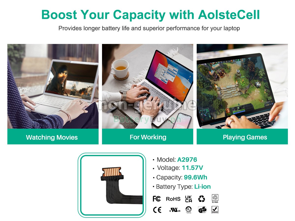 Our battery for Apple A2976 is composed of cells with Li-Polymer. As could be referred to on our website that there are two types of component with battery cells, which are Lithium Ion and Lithium Polymer. The lifespan and safety performance are virtually identical. In addition, Samsung, Panasonic, LG, and other major imported battery cells we choose can also provide better quality assurance.