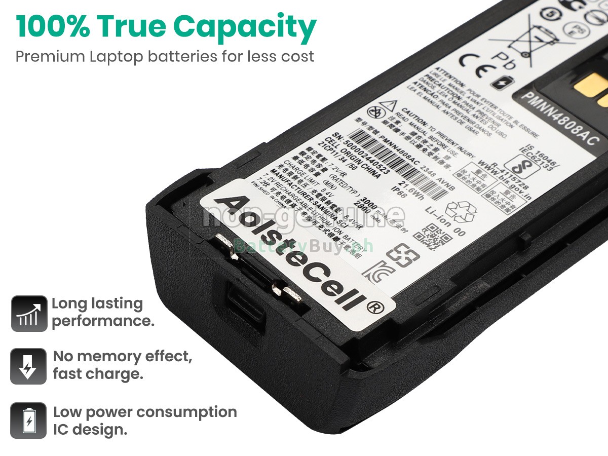 Our battery for Motorola PMNN4808A is composed of cells with Li-ion. As could be referred to on our website that there are two types of component with battery cells, which are Lithium Ion and Lithium Polymer. The lifespan and safety performance are virtually identical. In addition, Samsung, Panasonic, LG, and other major imported battery cells we choose can also provide better quality assurance.